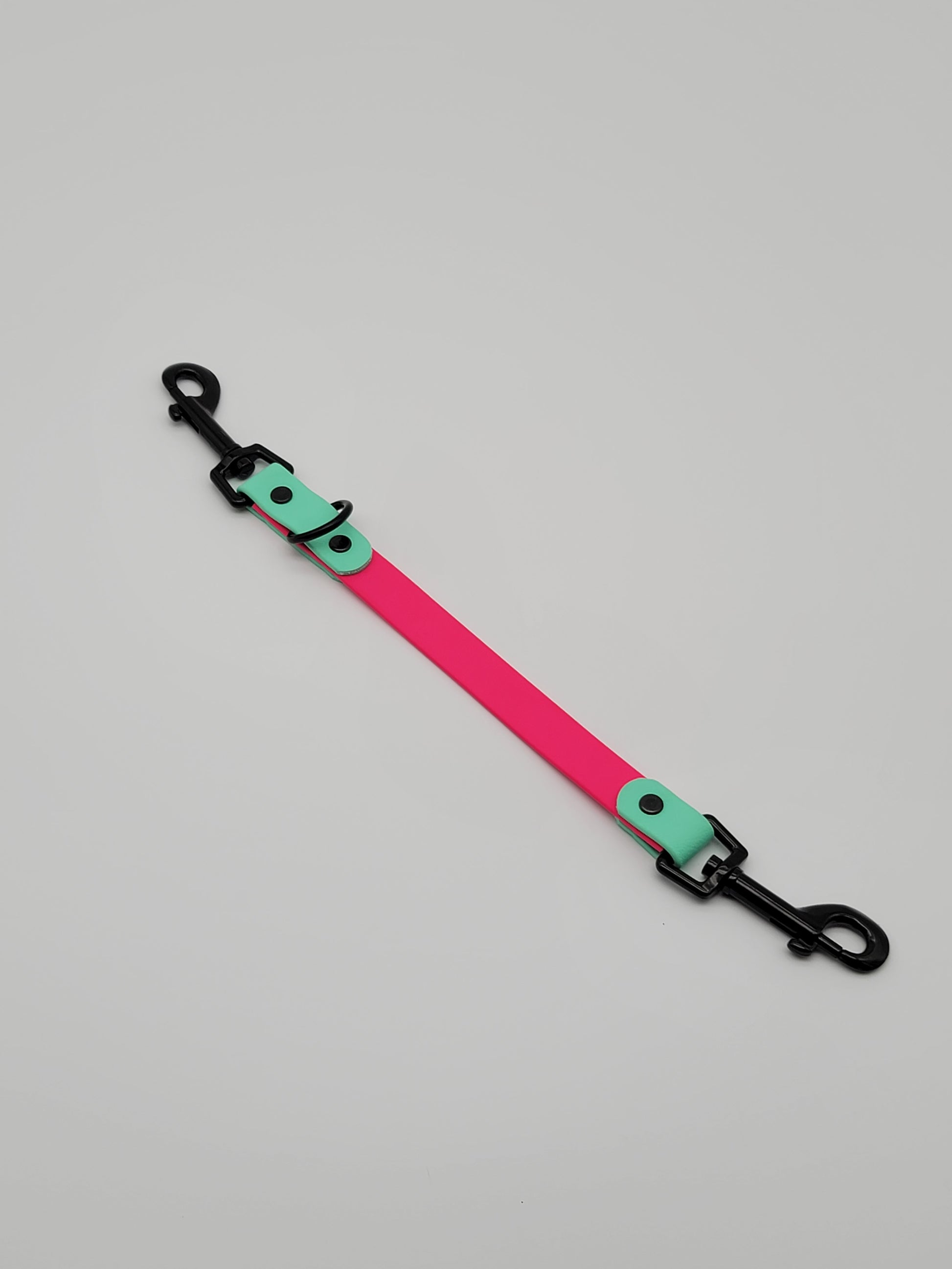 These harness safety straps are custom made to order with genuine 3/4" BioThane®. Complete with heavy duty tubular rivets welded D-rings and your choice of hardware, these safety straps are perfect for large medium and small dogs. Our safety straps feature a stylish two-tone design with an integrated D-ring for extra accessories. The harness safety strap attaches to your dog’s collar and leash to add a second point of contact in the event that your dog wriggles out of his or her harness.