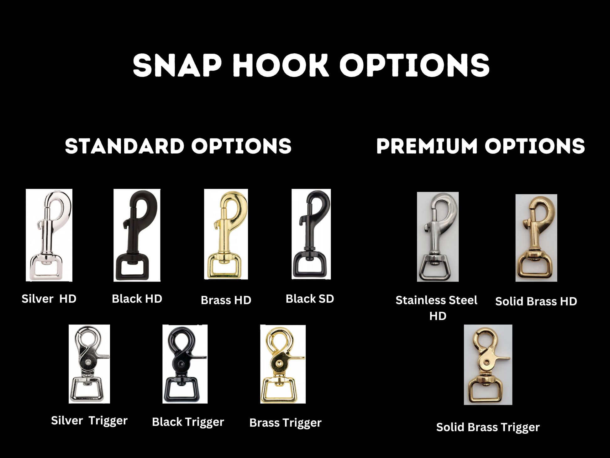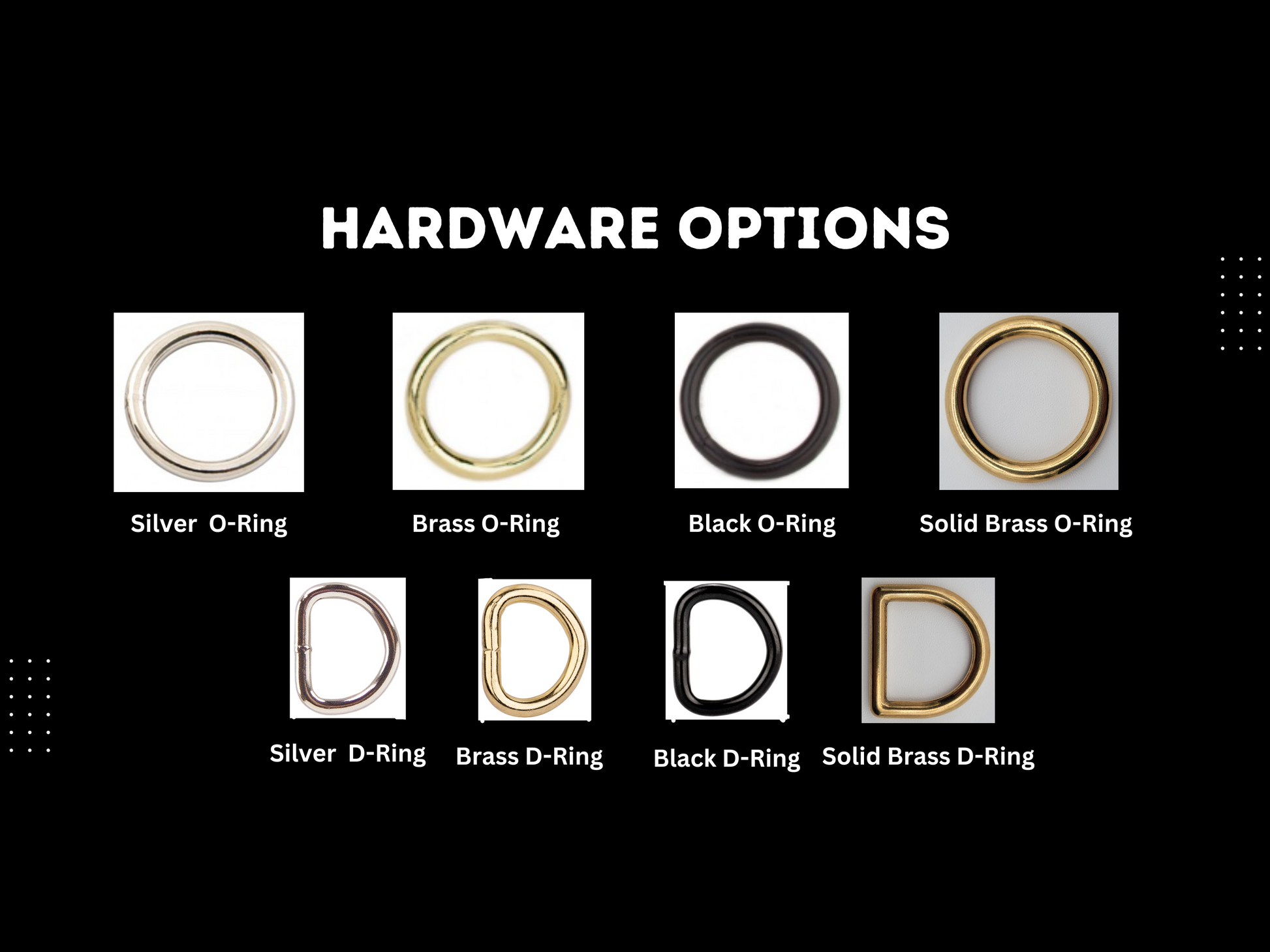 Our collars and leashes are made with high quality durable Steel hardware. Our Brass and Silver swivel snaps are nickel and brass plated to give them their glossy finish. The Black swivel snaps are powder coated and the Stainless-Steel swivel snaps have no additional finish on them. Our O-rings and D-rings are welded for extra strength and durability. They are also nickel-plated brass-plated and powder coated, respectively, to give their vibrant finish.